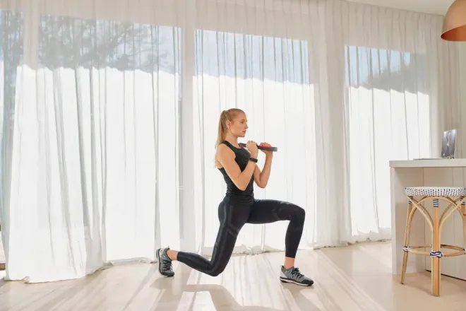Ein effektives und forderndes Training mit Schwerpunkt auf Bauch, Beinen und Po, zur Kräftigung, Straffung und Dehnung der Problemzonen. Dieses Low-Impact-Workout verbrennt ordentlich Kalorien und die eigene Fitness profitiert ebenfalls davon. Durch die optionale Nutzung von Equipment können Übungen, wie Squats oder Lunges, intensiviert werden.